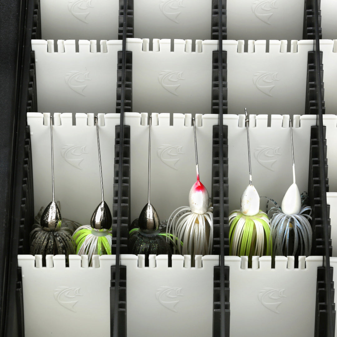 Designed to keep baits separated and organized, the Hangr also features a patent-pending Snap-N-Lock angled divider system that securely locks dividers with a snap. By storing baits at an angle, this allows for increased capacity and reduced entanglement. The Hangr’s innovative design allows for any size treble hooks to fit into the dividers while also having the ability to functionally store a large variety of baits. The snug fit notches securely hold baits in place in rough water and in all angles of storage. Comparable in size to other deep trays this box redefines bulk storage. Infinity Divider Technology gives the angler a fully customizable box ensuring that space is maximized while accounting for different sizes of lures.