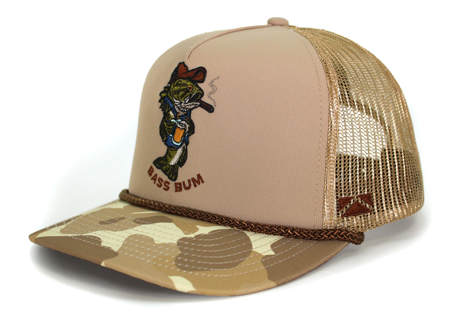 Show off your laid-back fishing lifestyle with the Paramount Outdoors “Bass Bum” Hat. Featuring a detailed embroidered bass character enjoying a cold drink and cigar, this cap brings humor and personality to your fishing gear. Built with a breathable mesh back and our signature Comfort Snap closure, it delivers a lightweight, adjustable, and stretch-fit feel. The structured front panel pairs with a camouflage bill and rope detail, making this hat perfect for days on the water, campfires, or just relaxing in style.