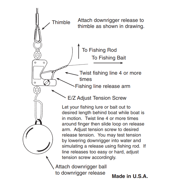 Du-Bro Release Clips are rust resistant and feature our E/Z Adjust Tension Screw for fine tuning of line release tension. Gives a clean release when fish strikes. Downrigger Release Clip mounts between the thimble and ball giving a clean release when the fish hits.