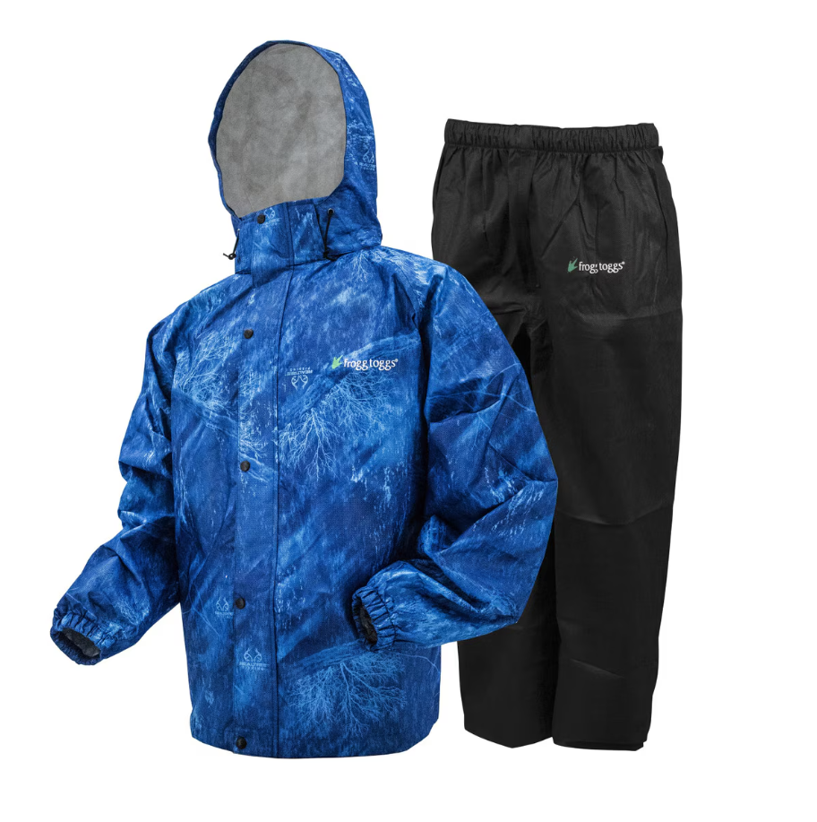 The two-piece frogg toggs® All Sport Waterproof Rain Suit is packable, portable, durable, and comes in a variety of colors and camouflage patterns. This two-piece rain suit is made from our signature 2-ply fabric: the interior is fiber-based for breathability and the film-based outer shell offers waterproof protection in inclement weather. The rain jacket features a full hood with a draw cord barrel lock for easy adjusting, a full-length front zipper with snap-down storm flap for extra protection, comfortable elasticized cuffs at the wrists, and raglan sleeves for improved range of movement. The rain pants feature a four-panel cut with an elasticized adjustable waist for a snug yet comfortable fit, and large leg openings that make it easy to pull on pants over shoes and boots. Both the rain jacket and pants feature fully taped and sealed seams. Protect yourself in any weather wearing the two-piece frogg toggs® All Sport Waterproof Rain Suit.