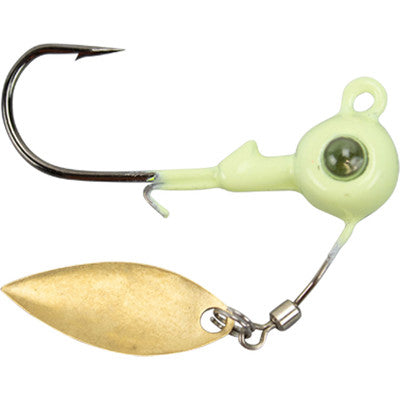 The Google Eye Spinner Jig features a willow blade attached by a premium swivel directly below the head. The premium swivel keeps the blade turning no matter how slow you retrieve it. Adding in our patented Google Eye “Glass Rattle” is a combination of sight and sound to trigger more bites in all water types! Shockwave Rattle System has been designed to call fish in and trigger a bite. The Google Eye Jig can be rigged with your favorite Kalin’s plastics, or with live bait. Jig it, Rip it, or use a slow steady retrieve along the bottom. Glass eye to reflect light and add additional visual dimension.