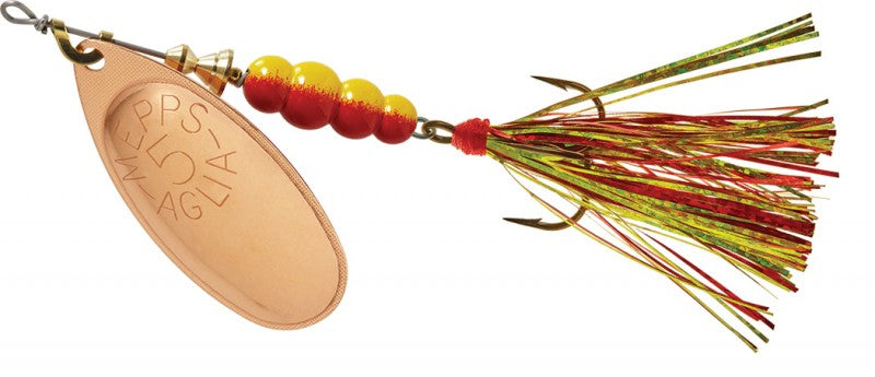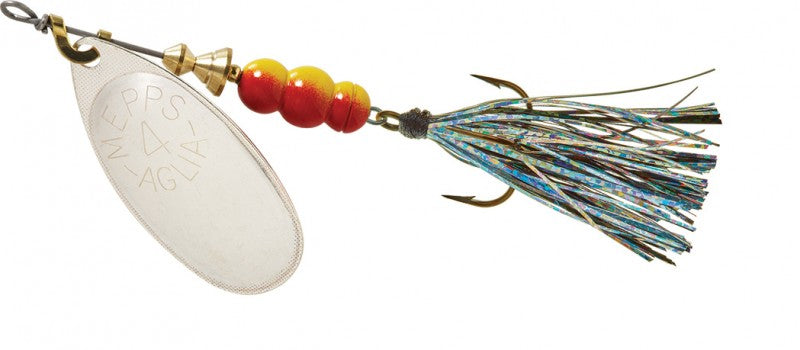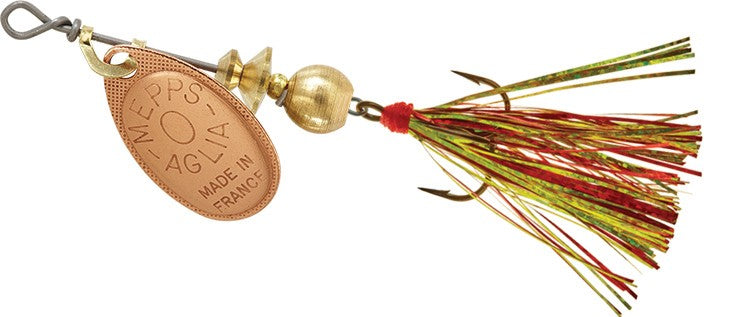 The Mepps® Aglia® Flashabou combines the vibration and flash of a classic Mepps® Aglia® blade with a highly reflective, hand-tied flashabou tail for attractive, shimmering action in the water.