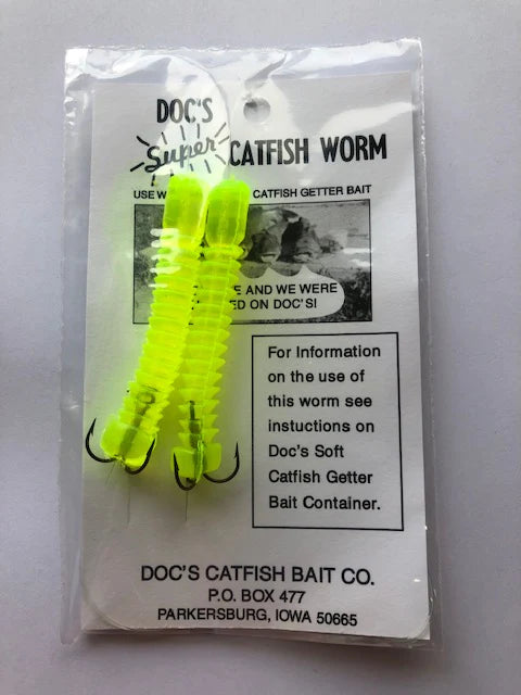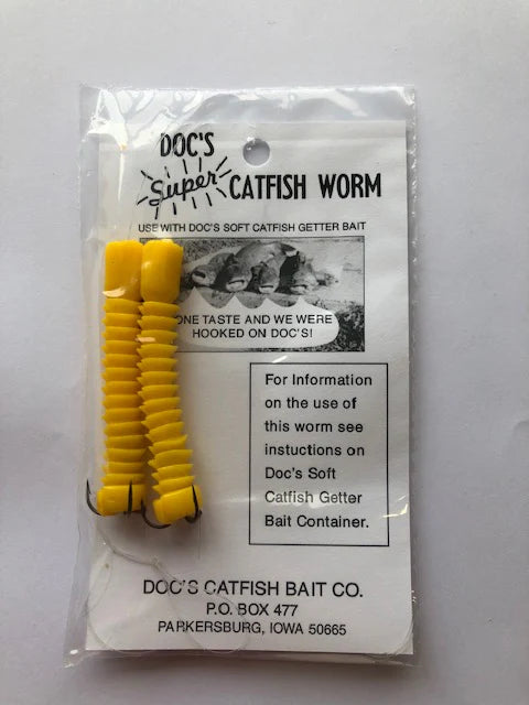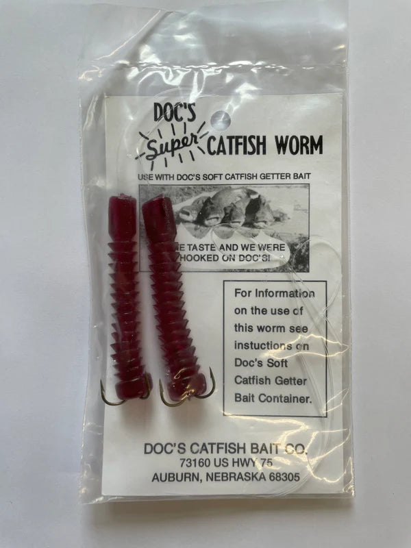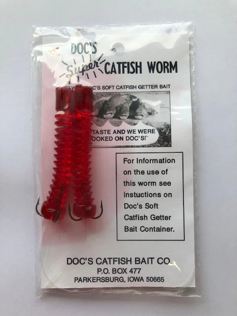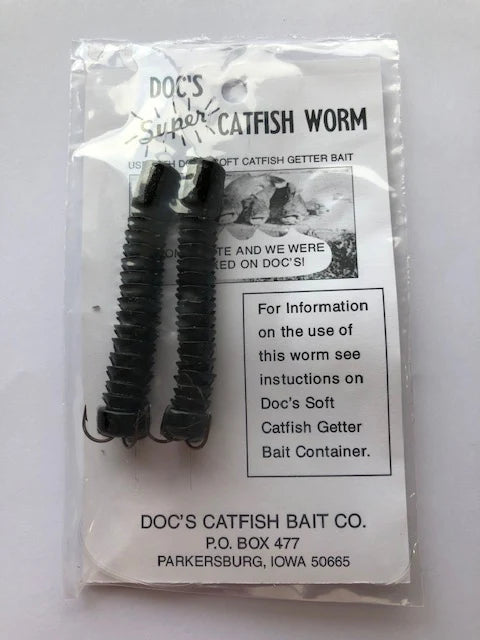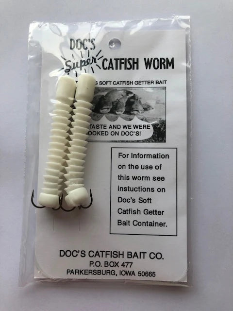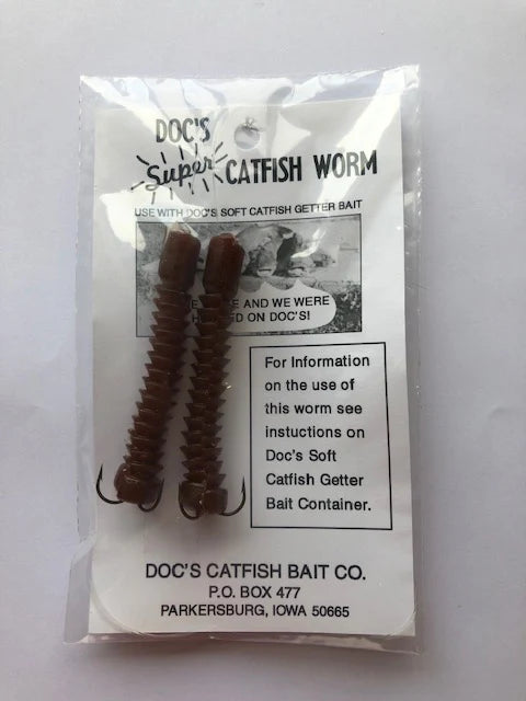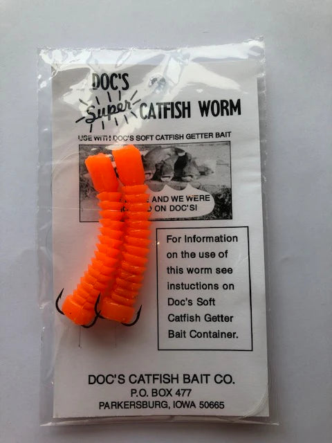 Worms are 2 1/2 inches long and 7/16 inches thick with a 20 lb test line and leader through them, tied to a size 6 VMC Treble hook. Made of tough soft plastic and designed for use with Doc's Dip Bait and MondoMash.