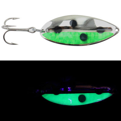 Moonshine Mainliner Casting Spoons offer added attraction in deeper depths and low-light conditions where other lures fail. Catch fish after fish on overcast days with this high-quality super-glow product. The coloring and glow design will catch a wide variety of fish, including bass, salmon and steelhead, walleye, stripers, and musky. Get yourself some Mainliner Casting Spoons, and you'll be irresistible to any fish you seek.