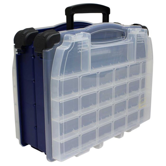 The ultimate way to organise your gear is with this layered, double-sided satchel storage box. Both sides of the satchel is designed with a transparent lidded, top storage area and a lower deeper storage area, both with adjustable compartments. Separate latches and hinge system means you can access each compartment independently. The LockJaw™ side latches wrap around the sides for secure closure.