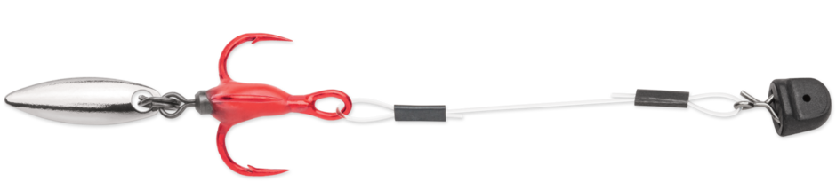 Sufix® 12lb. fluorocarbon leader with VMC ® Crossover Cap™ that allows you to connection directly to the hook. “Fast-Snap” connector resin sealed swivel & willow blade for maximum rotation & flash.